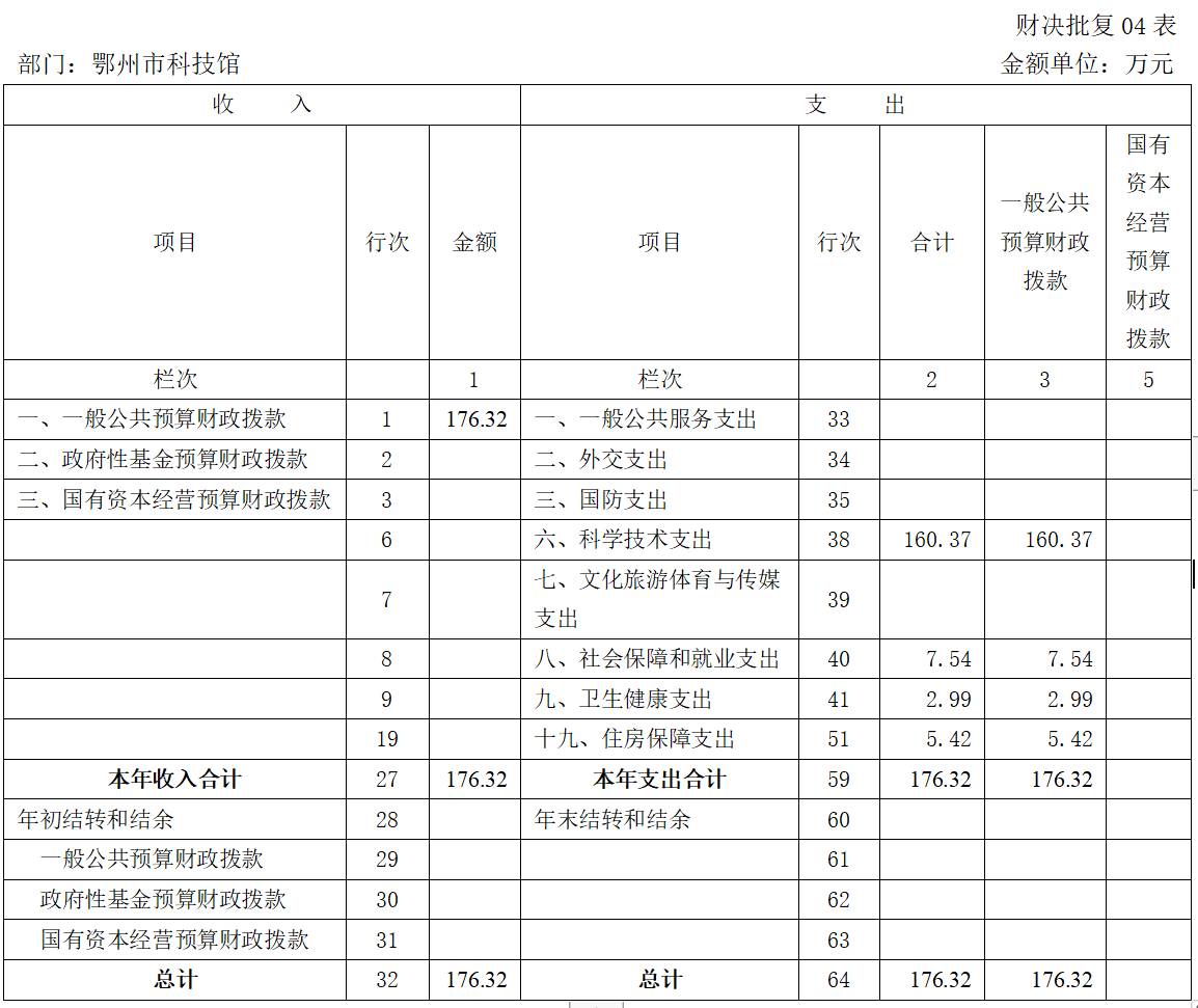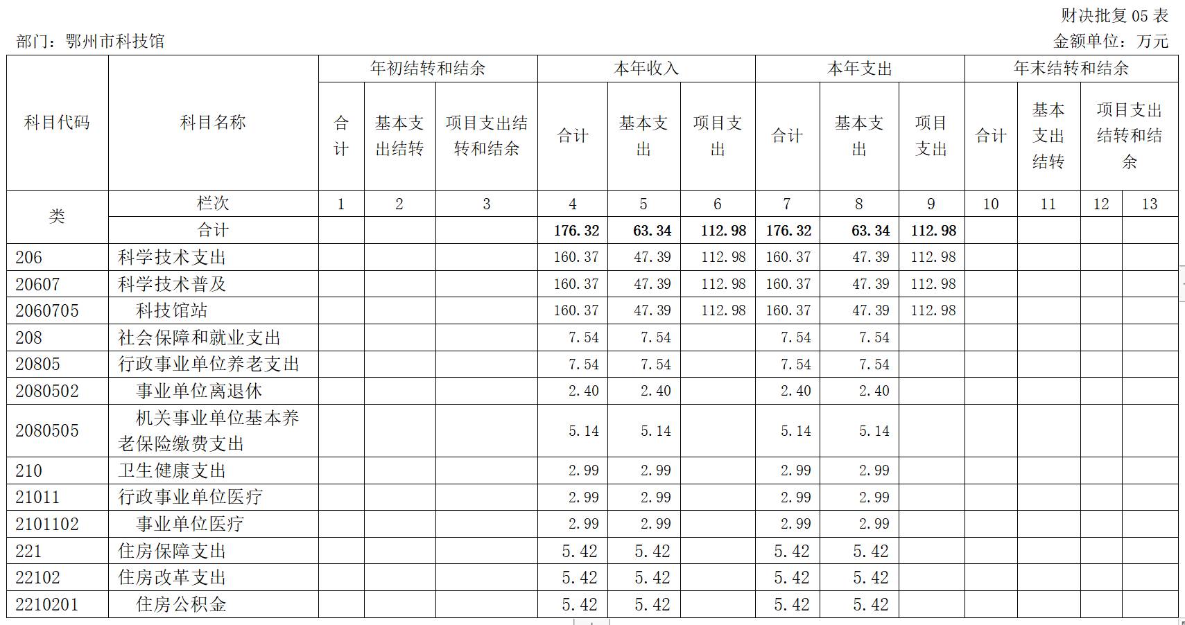 2022年度财政拨款收、支总计均为176.32万元。与2021年度相比,财政拨款收、支总计各增加2.18万元,增加 1.25%。主要原因是主要原因是2022年增加了一个项目、一名在职人员转成退休人员。