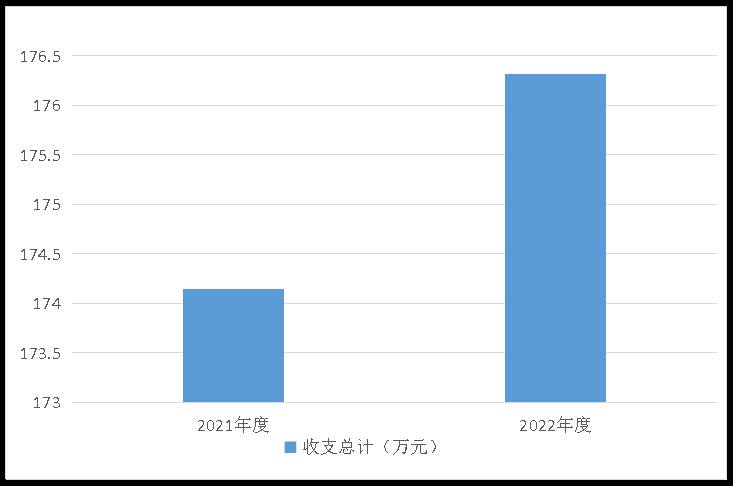 2022年度收、支总计均为176.32万元。与2021年度相比,收、支总计各增加2.18万元,增加 1.25 %,主要原因是2022年增加了一个项目、一名在职人员转成退休人员。