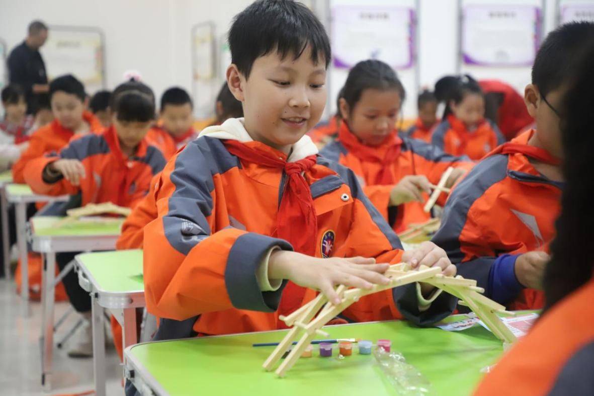以文明成果为切入点,科普老师带领学生们认识了一项独特的发明——倍力桥。随后,在科普老师和志愿者的引导下,同学们兴致勃勃地投入手工环节,制作属于自己的倍力桥模型。他们根据所学的受力分析与结构特点等知识,小心翼翼地将零件逐层拼接起来,最终制作出一座座弧度完美的桥梁。他们满脸笑容,如捧起一轮轮弯月般,捧起一座座精巧的小桥,也捧起了文明的珍贵成果,以及一颗沉浸于科技文明之美的童心。