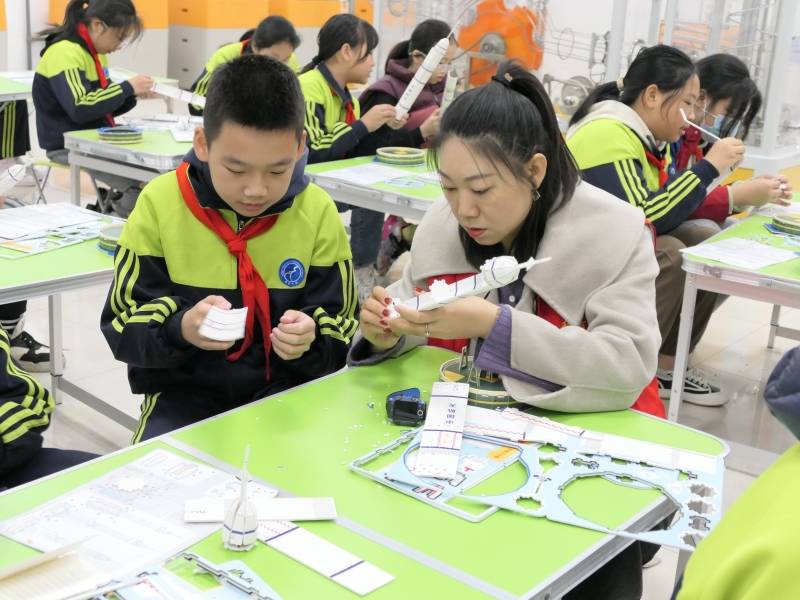 在大家的万众瞩目下,手工环节瞬时开启。同学们沉浸式制作了“神舟十三号”火箭模型,在实践过程中,既锻炼了他们的动手能力,更让他们在制作中增加了对航天科技的了解和热爱,也让他们更加感受到科技的力量和祖国的强大。
