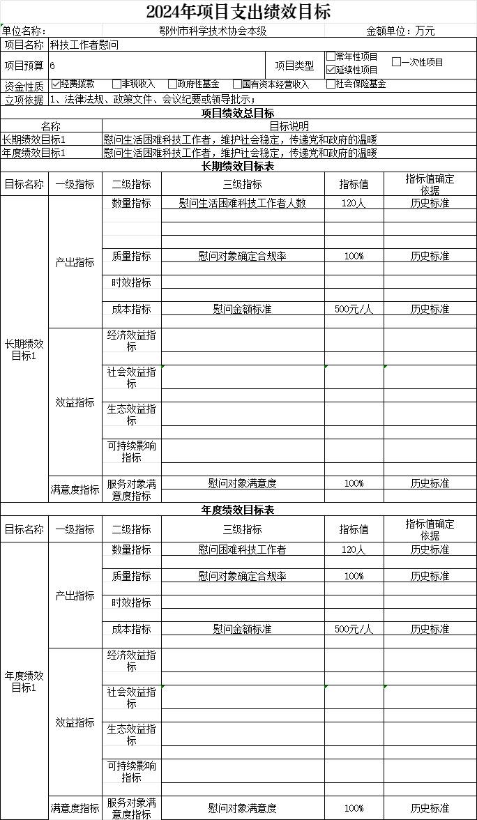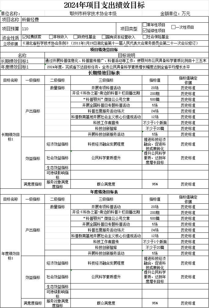 鄂州市科学技术协会本级-2024年项目支出绩效目标