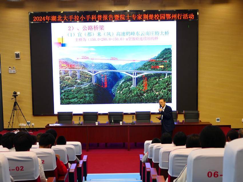 中国中铁大桥局集团有限公司专职副总工程师杨齐海分别在葛店经开区武汉三新职业技术学校和新华中学作题为《揭开桥梁建造技术的神秘面纱》的科普讲座。他用通俗的语言、生动的比喻,将一架又一架中国桥铺开在同学们眼前,让高深莫测的工程知识变得浅显易懂。同学们透过中国桥,领略到了中国造桥技术的变革与发展,感受到了中国国力的飞升与崛起。