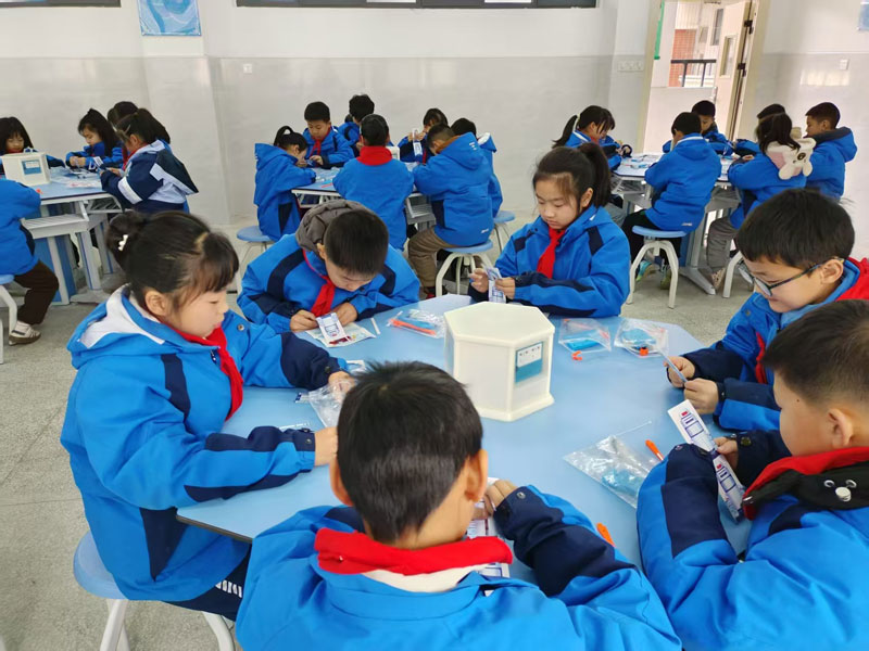 讲座结束后,三(4)班的学生们走进了科普教室,参与了一场别开生面的模拟火箭发射科普小实验。在实验中,学生们亲手操作实验器材,观察火箭发射的全过程,不仅学习了相关的科学知识,还体会到了科学探索的乐趣。