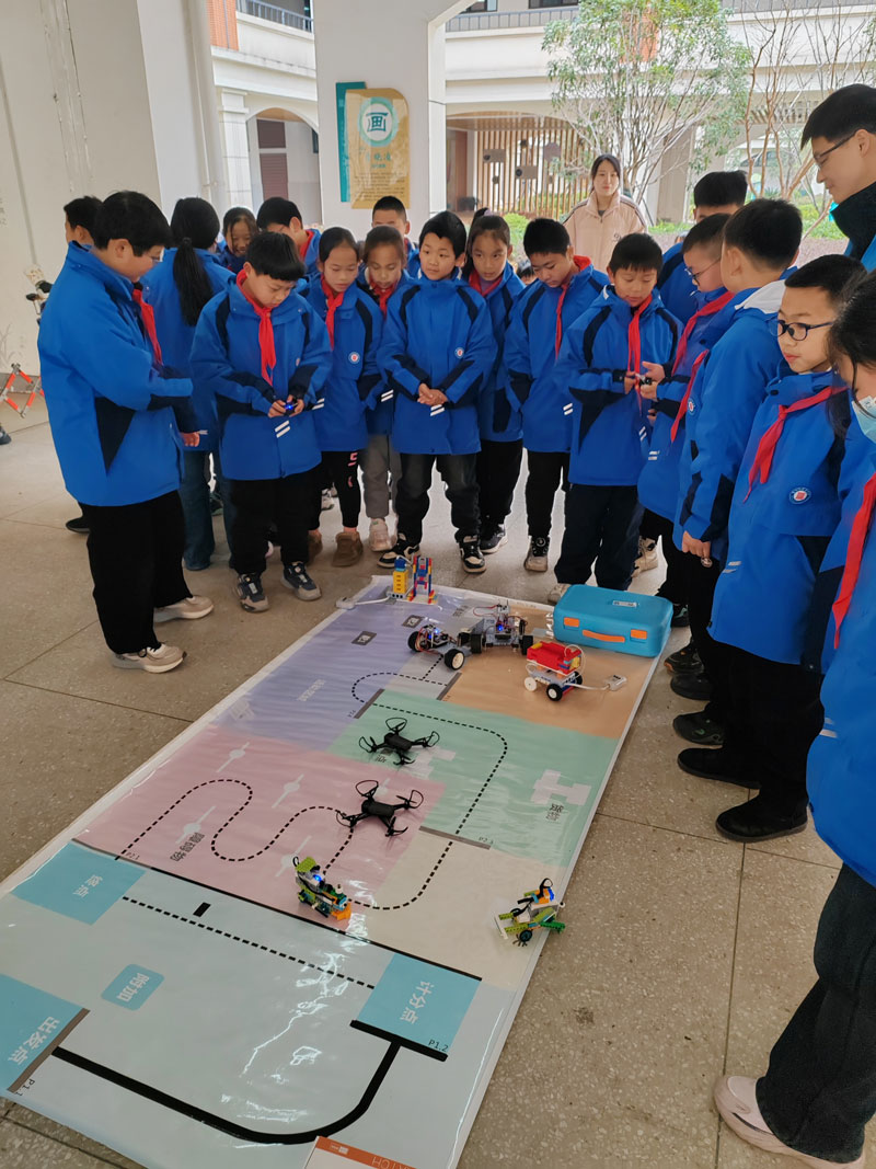 在室外,一二年级的学生们参观了人工智能教学机器人。他们被这些能够自主移动、执行任务的机器人深深吸引,纷纷驻足观看。其中,武昌学校一(3)班的学生代表翁一辰还为大家带来了一场精彩的机器人竞赛展示。他的精彩表现不仅赢得了现场师生的阵阵掌声,更激发了学生们对人工智能技术的浓厚兴趣。