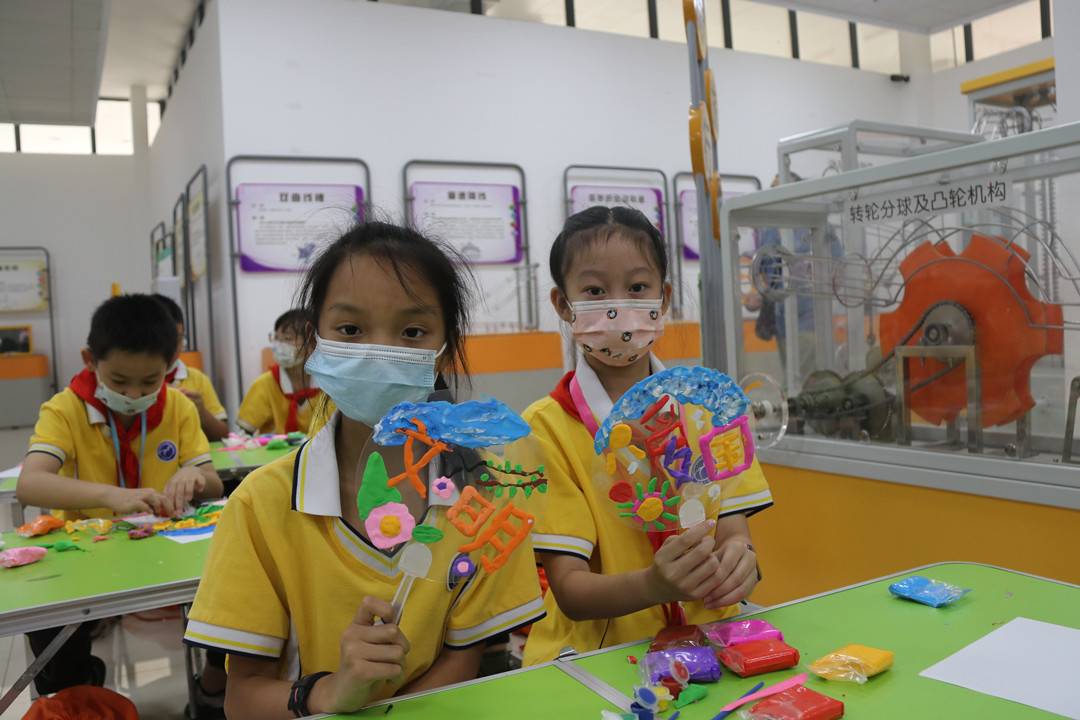 只见同学们有的用彩泥在团扇上捏出“自由”和一只白鸽;有的在扇上用水彩画上五星红旗和若干花朵,并在旁边写上“爱国”;有的用彩泥勾勒边框圈捏出“公正”二字……五彩缤纷的画面形象具体地表达着孩子们积极向上的价值取向。科普志愿者们则不时指导,并为孩子们的创新能力鼓掌点赞。