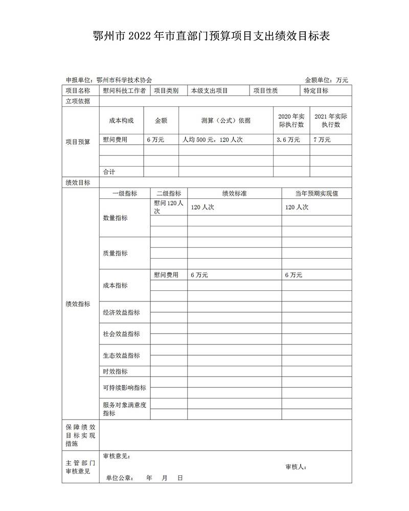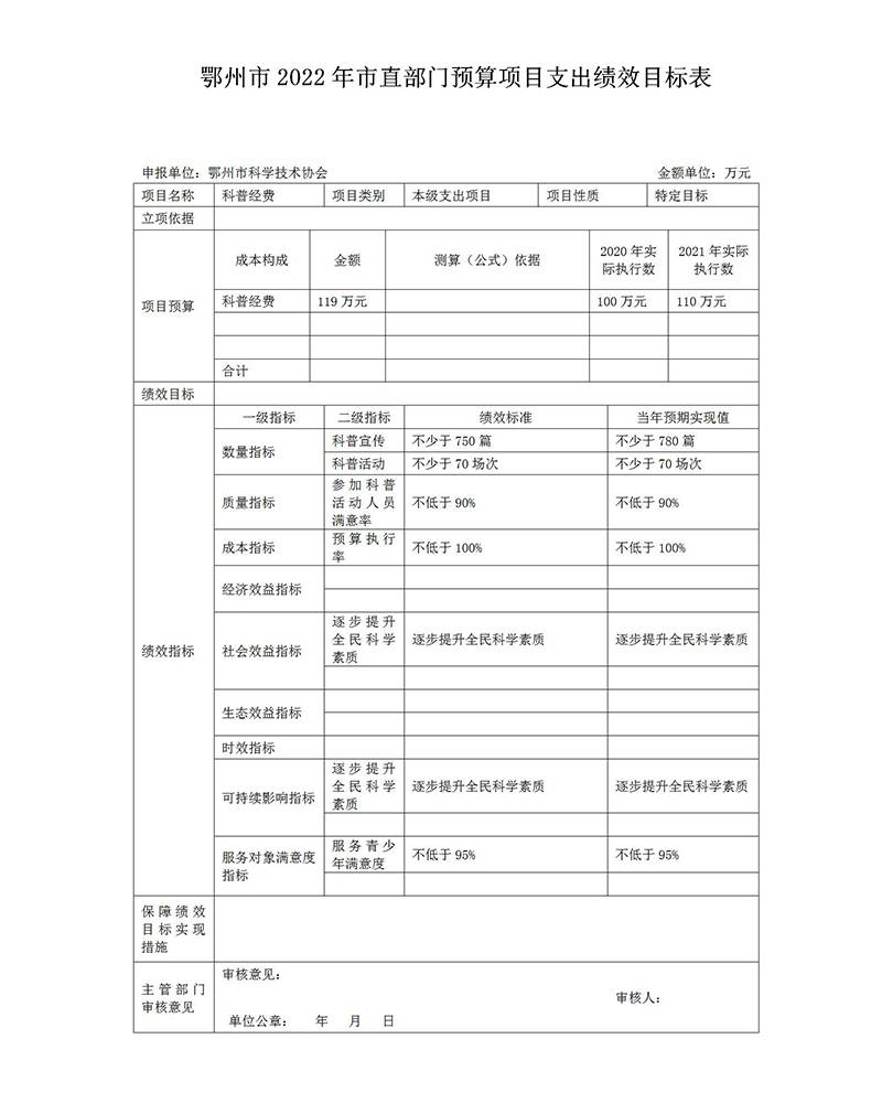 2022年鄂州市科学技术协会预算项目支出绩效目标表