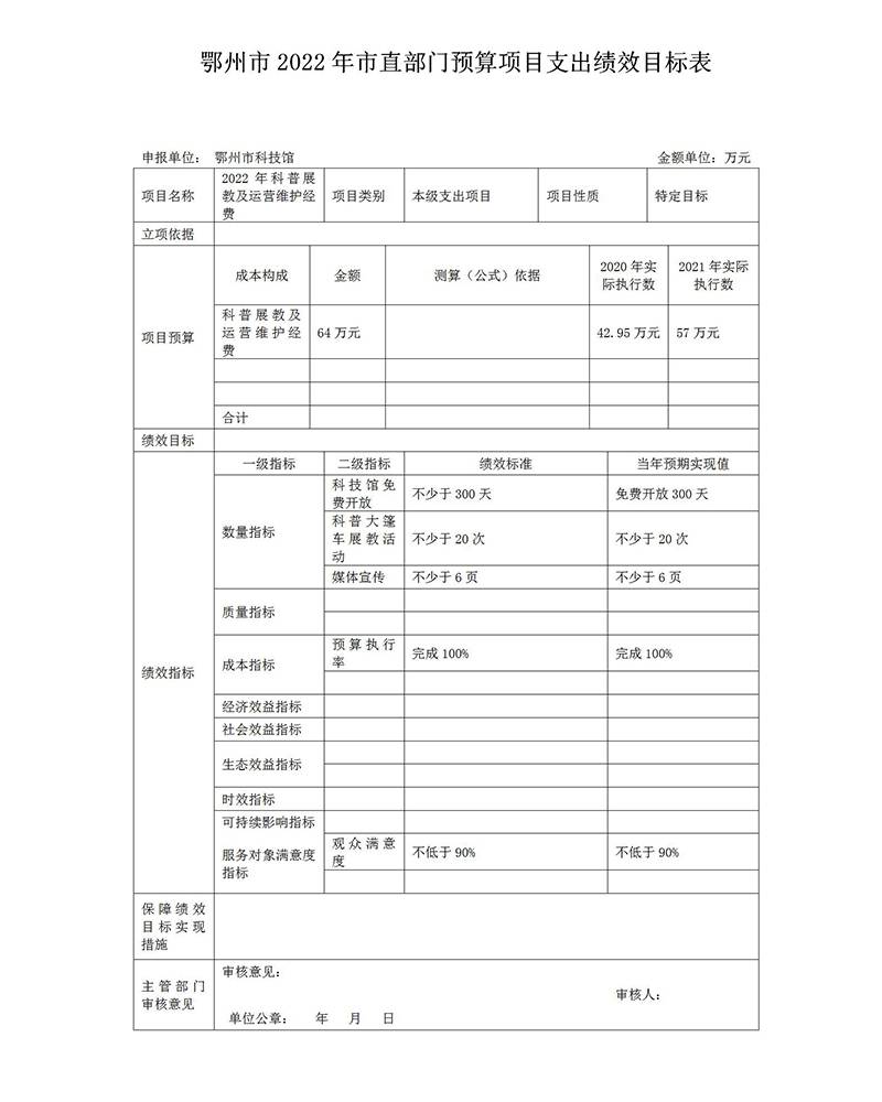 2022年鄂州市科技馆预算项目支出绩效目标表