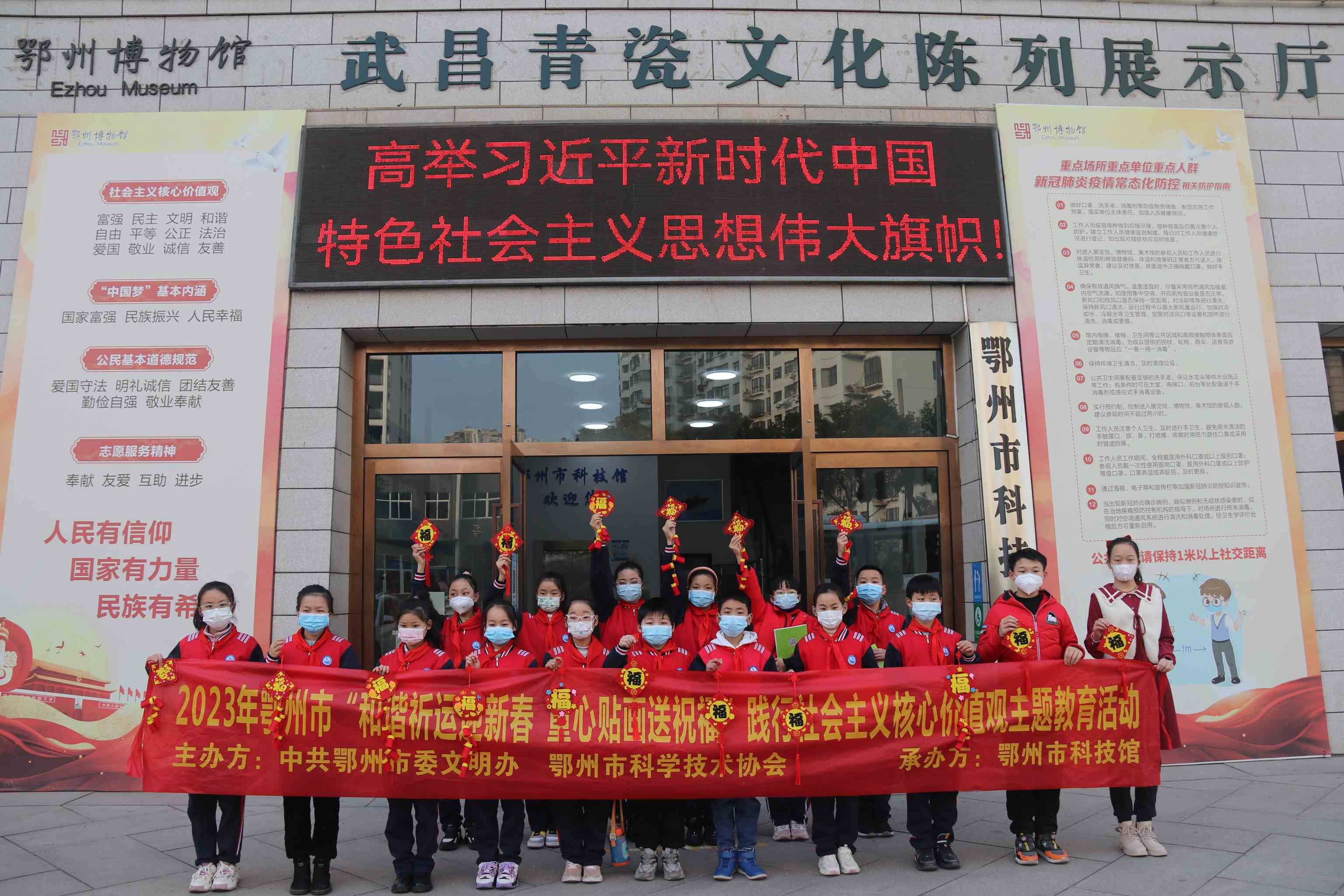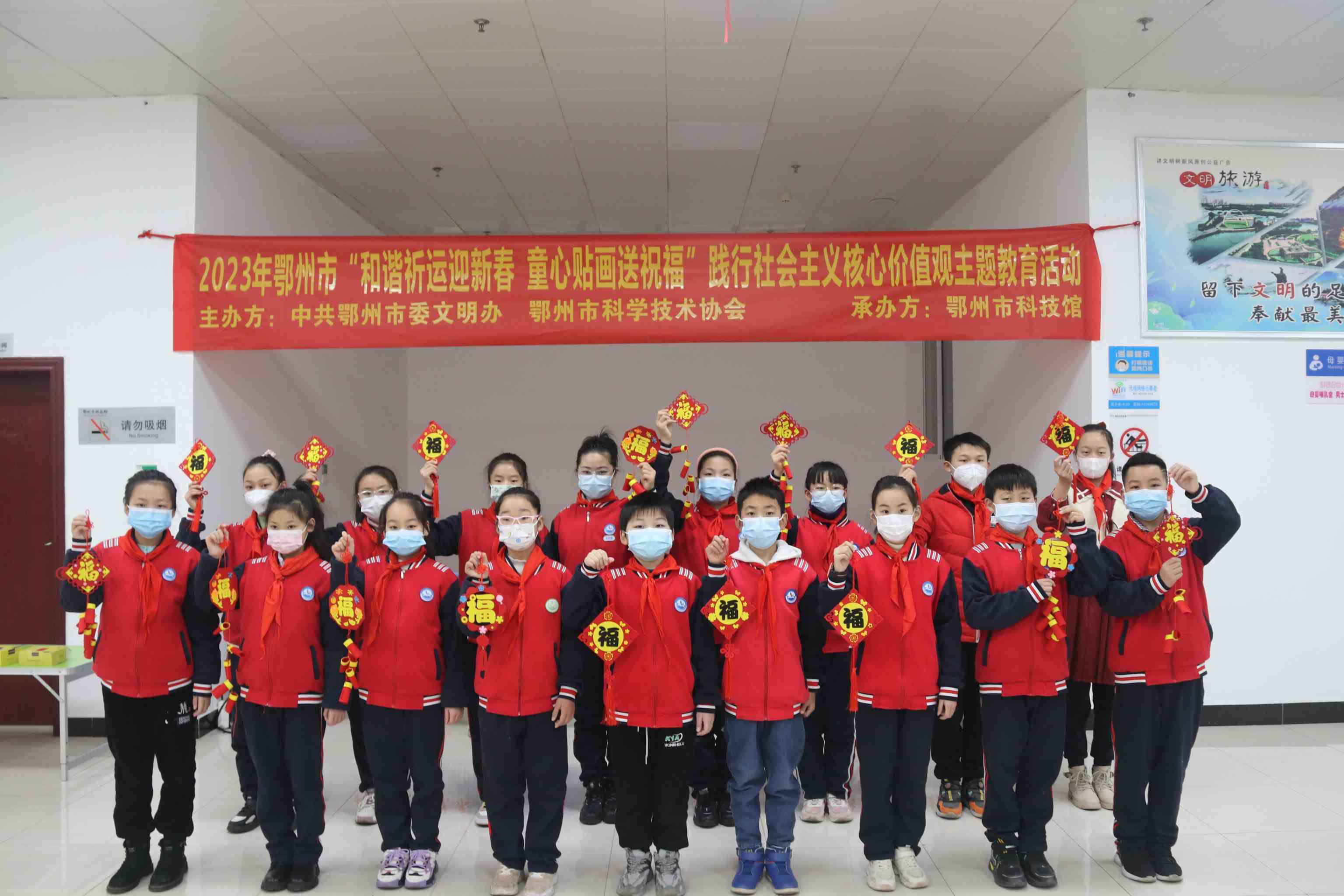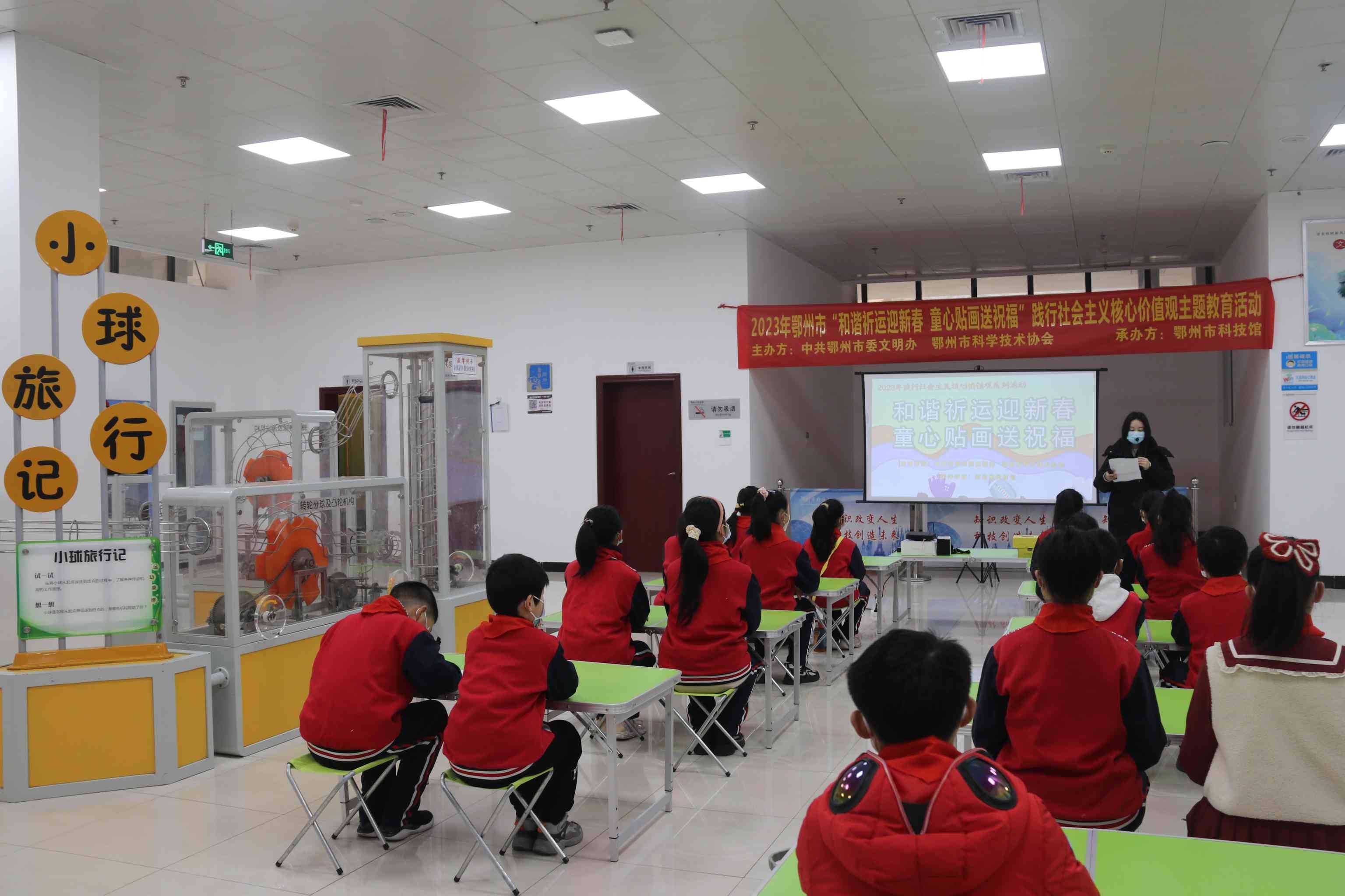 虎跃雄关,兔临春境,鼎故辞旧,万象更新。1月4日,鄂州市科技馆内传来阵阵童声笑语,欢乐祥和的气氛在新年伊始蔓延开来。当日下午,为深入培育和践行社会主义核心价值观,激发学生的文化自信和艺术素养,形成健康向上、文明和谐的文化氛围,迎接新春到来,鄂州市科技馆开展了“和谐祈运迎新春 童心贴画送祝福”的主题活动,此次活动由中共鄂州市委文明办、鄂州市科学技术协会主办。