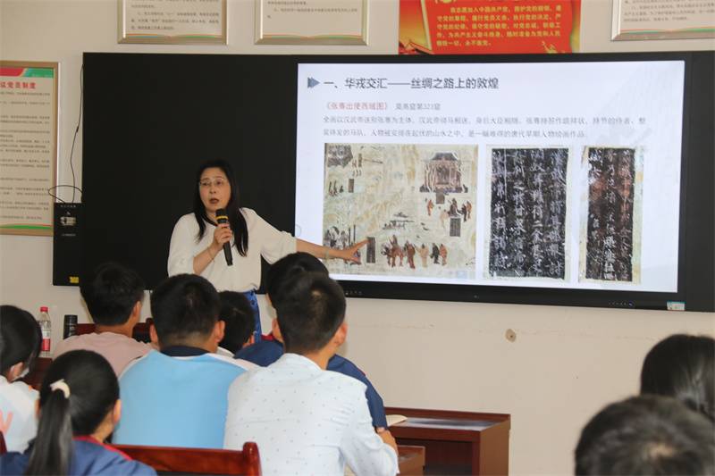 5月9日下午,倪婉老师来到梁子湖区宅俊中学,通过讲述我国历代王朝对敦煌的开发与保护,带领七年级的学生们穿越千年,开启敦煌之旅。