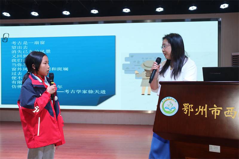 上图为5月9日上午倪婉老师在鄂州市西山小学开展“考古是啥”科普活动